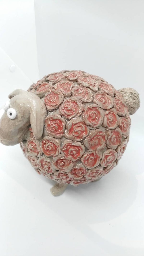 Dit schaapje is gemaakt uit antraciete klei. Elk roosje werd individueel gemaakt en bevestigd.