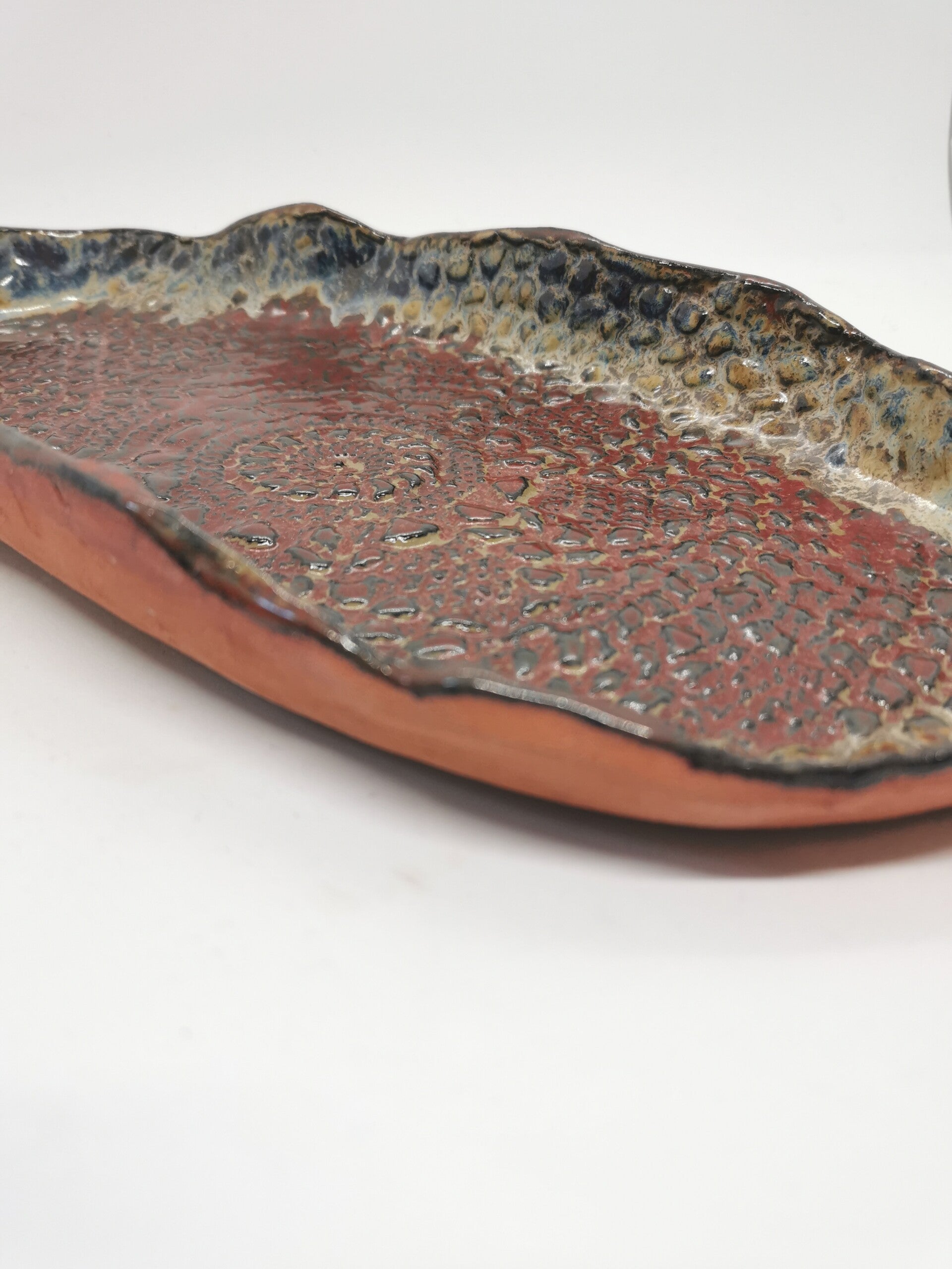 Een handgevormde schaal gemaakt uit rode klei. Er zit een kantpatroon in.