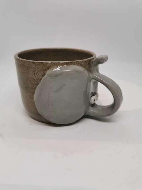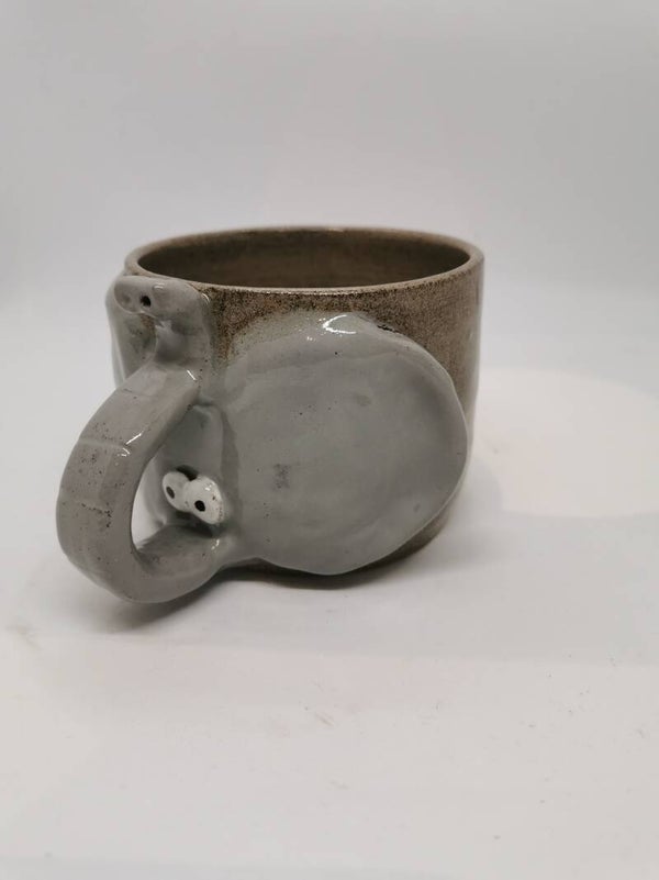 Een koffietas gemaakt uit bruin gespikkelde klei. De olifant is ingekleurd met aangepast ingekleurde glazuur. De rest heeft een transparante glazuur gekregen.