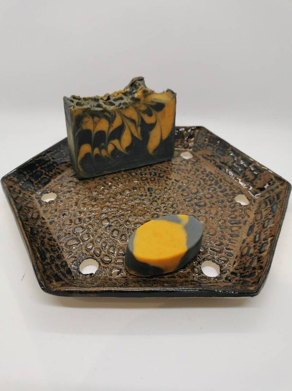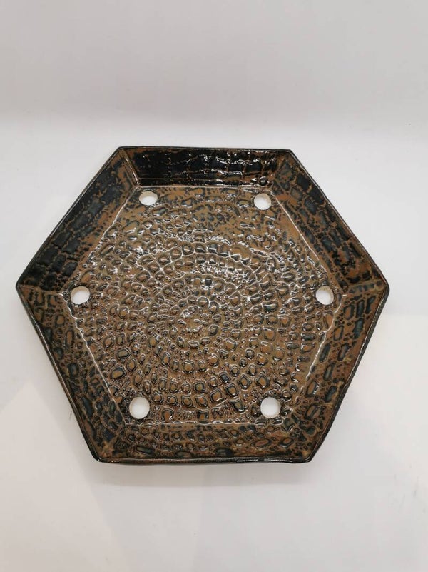 Een grote zeepschaal met kant ingedrukt. De kleuren zijn als de stenen in een rivier.