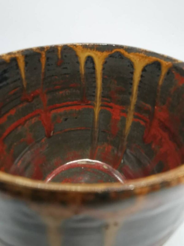 Het lijkt net alsof hij in brand staat met lava overstromend. Hij heeft een aantal putjes in het glazuur wat wij keramisten 'pinholes' noemen. Meestal wil je niet dat dit voorkomt maar in dit kokend thema is het juist extra leuk.