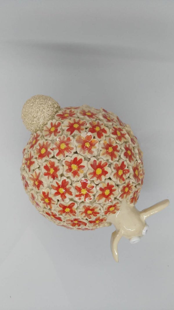Dit schaapje op pootjes draagt een bloemenjasje. Handgemaakt en handgeschilderd.